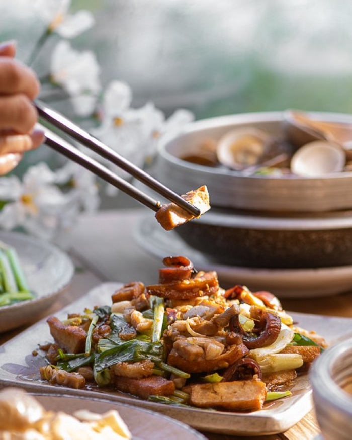 客家小炒是客家料理中廣為人知的經典,源自客家人對食材的巧思運用與生活智慧。在「四炆四炒」的料理哲學中,小炒為其中一項,強調大火快炒、食材原味與層次分明。傳統客家小炒常以豬肉、魷魚、豆干等素材為主,透過火候、鍋氣與調味詮釋土地精神,是一道極具地方代表性的經典菜色。